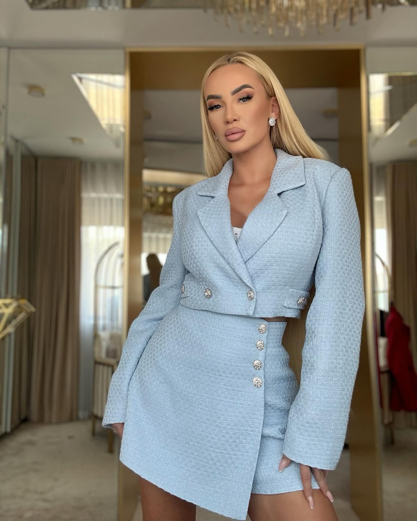 Marynarka o krótszym, luźniejszym kroju wykonane z mięsistego tweed’u z domieszką bawełny w pięknym błękitnym kolorze. Krój z kołnierzem, klapami z wszytymi poduszkami na ramionach, które dodają elegancji. Zapinana jest z przodu na dwurzędowe, srebrne guziki. Element guzików znajduje się także na dole rękawów w mniejszej wersji. Dodatkowo po bokach posiada paski z tymi samymi guzikami, co daje możliwość regulacji dopasowania w talii i możliwość jej wytaliowania. Dolna część marynarki z tłu posiada wszyty elastyczny ściągacz. Model z błękitną podszewką.